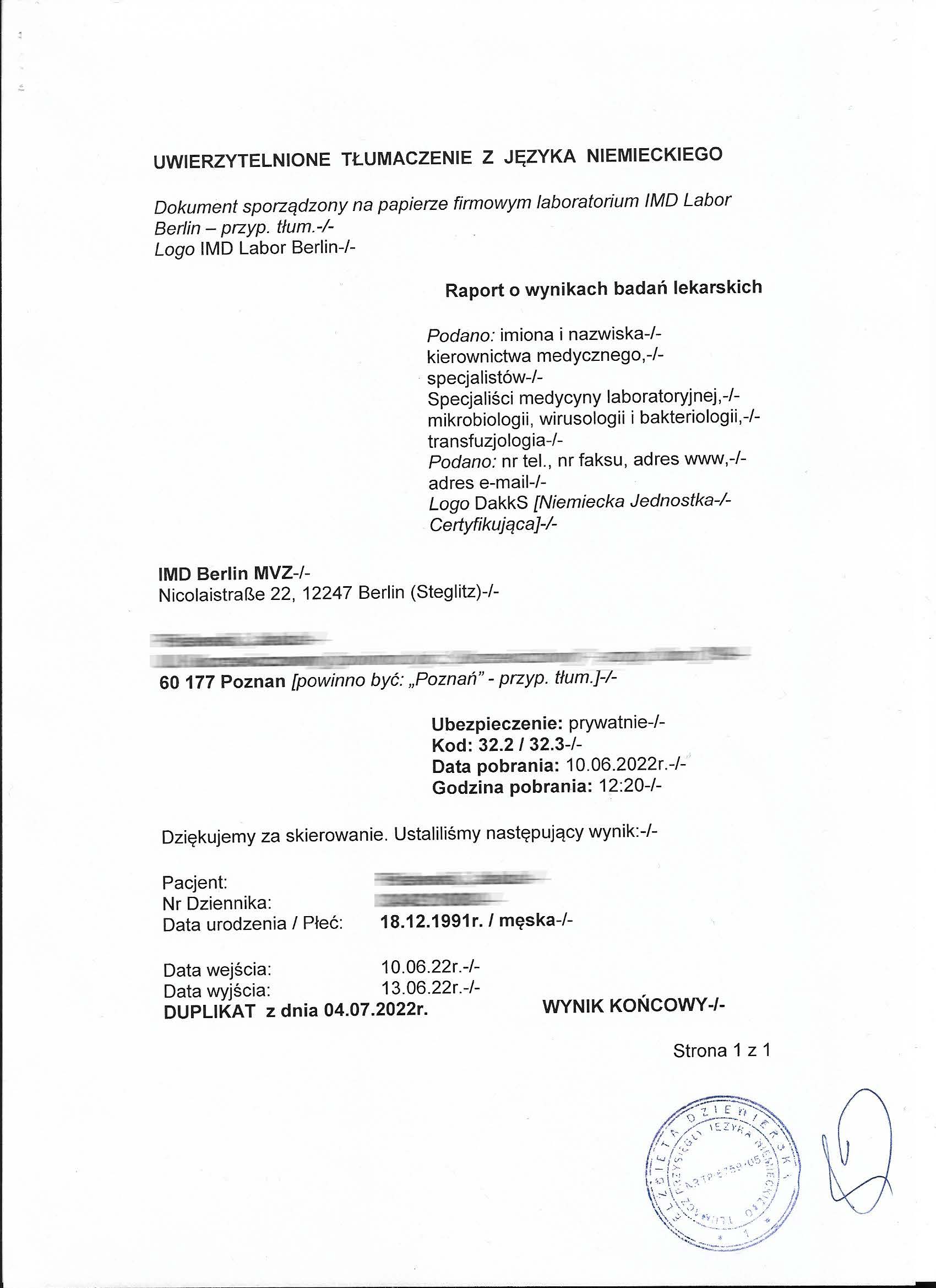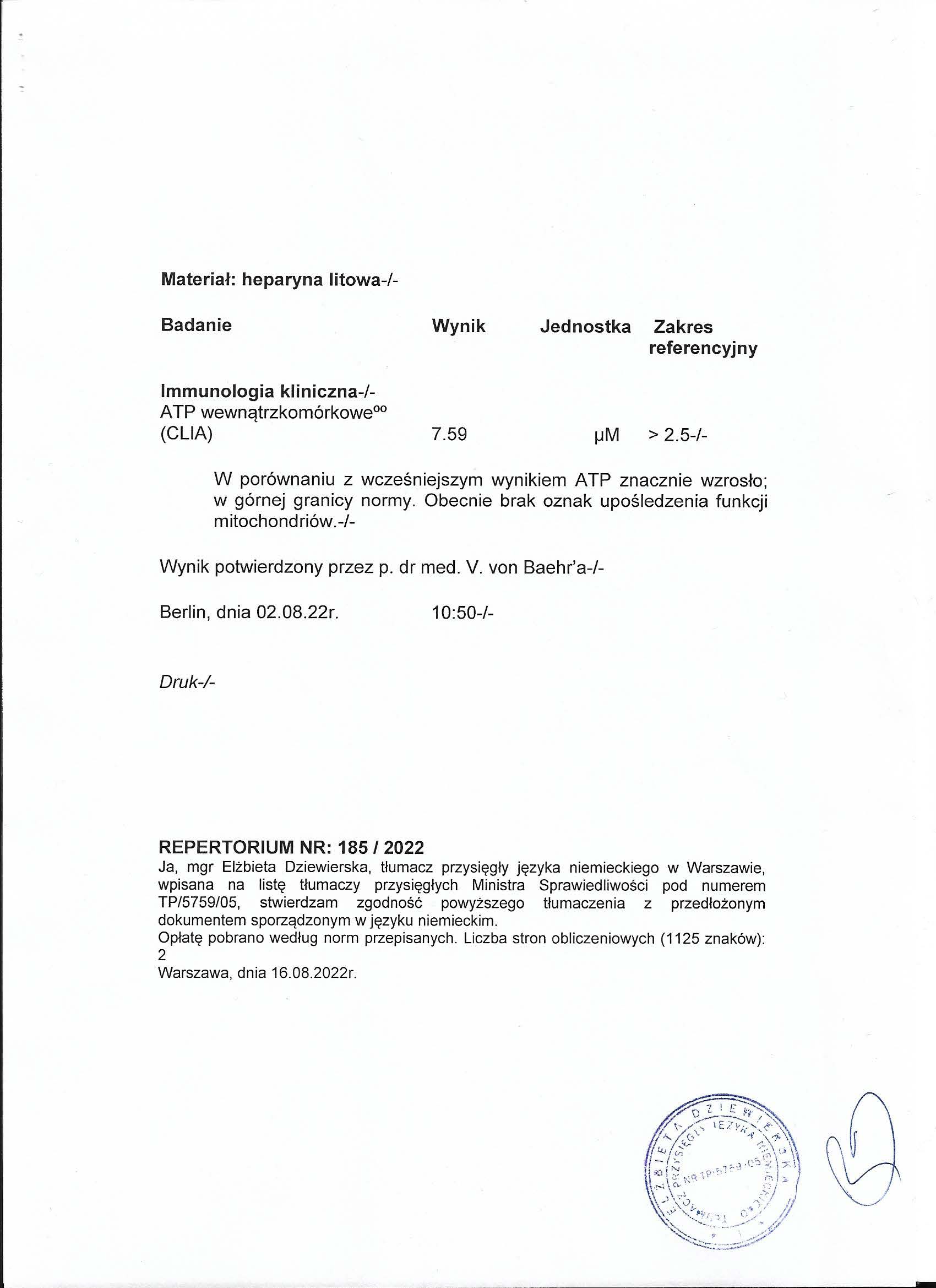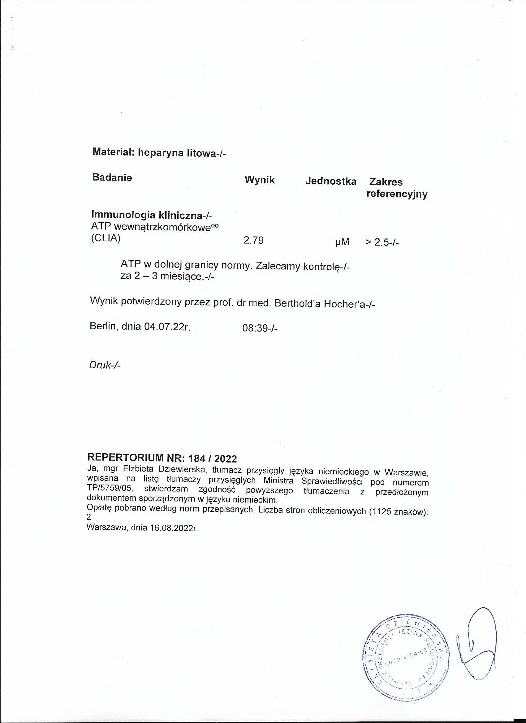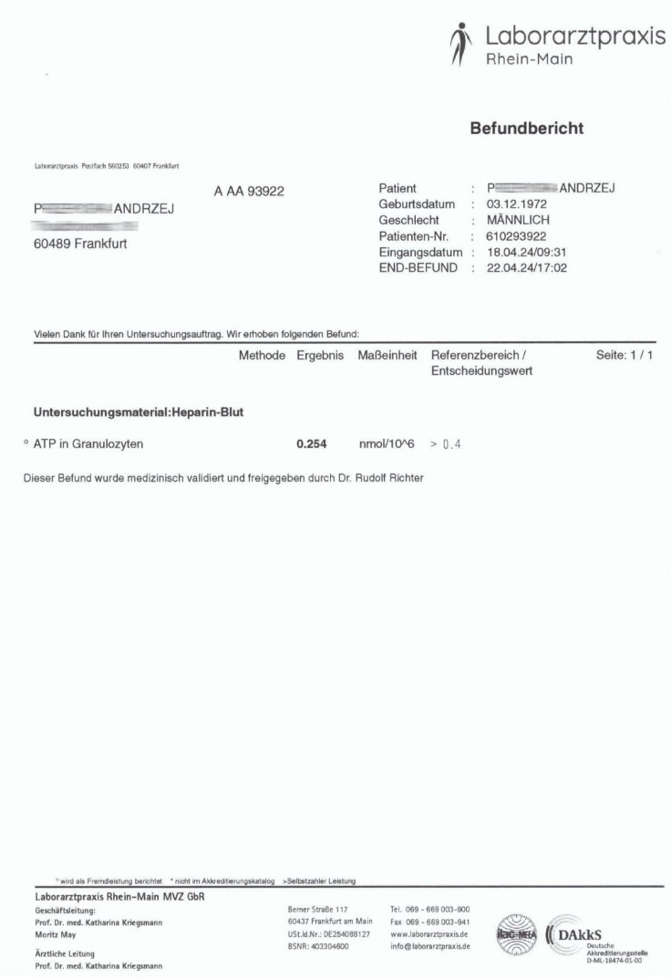 W organizmie mężczyzny, w badaniu z dnia 22.04.2024 widoczny poziom ATP w granulocytach wynosił 0,254nmol , po 2 miesiącach terapii preparatem, poziom ATP wzrósł do 0.522nmol czyli o 105,5%.
