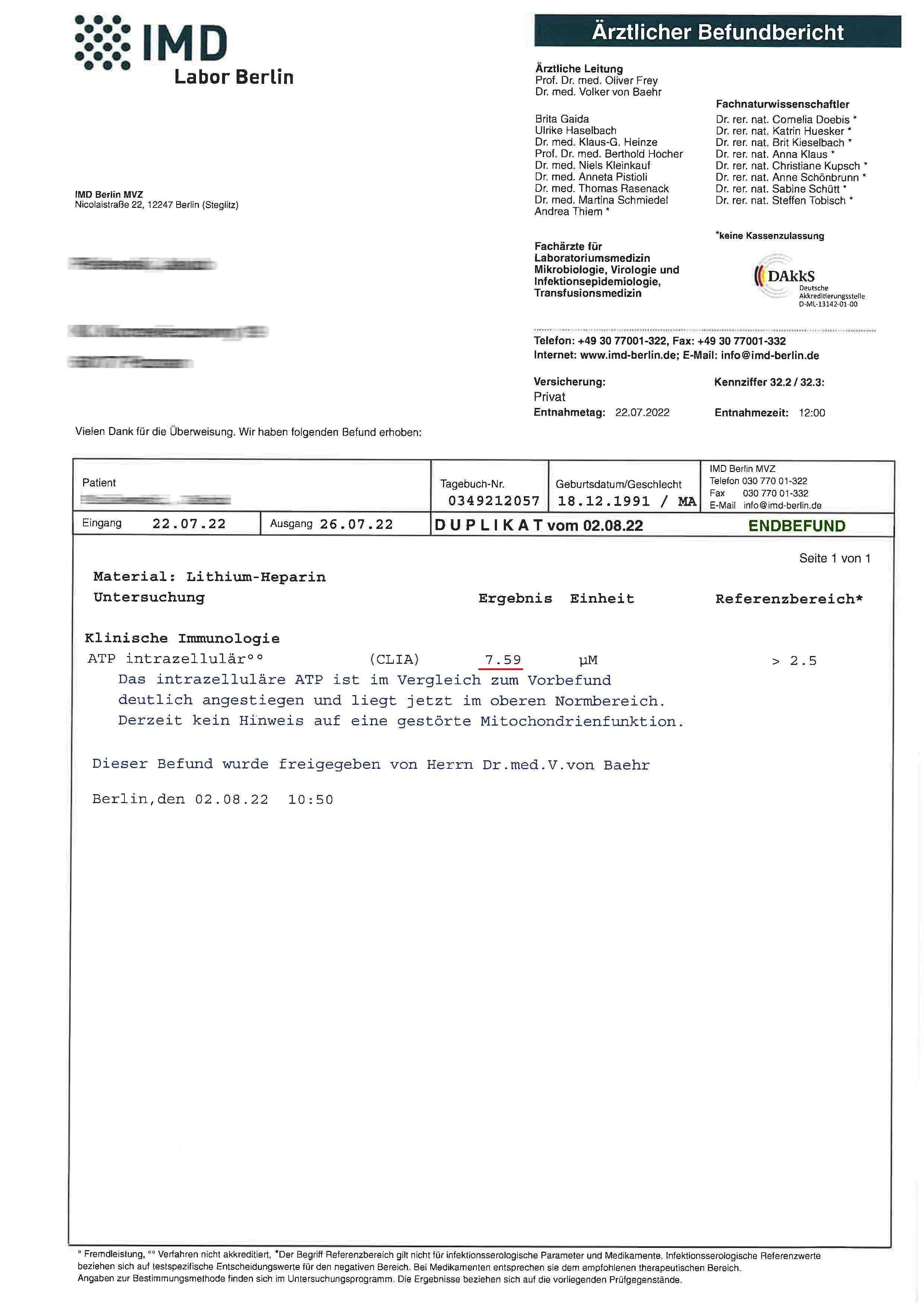 We współpracy z laboratoriami międzynarodowymi, takimi jak IMD Labor (Berlin) i Laborarztpraxis Rhein-Main (Frankfurt), udowodniono podniesiony poziom ATP wewnączkomórkowo o ponad 170% oraz ponad 100% w granulocytach.